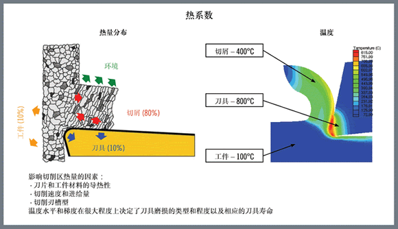 工件材料的不同導(dǎo)熱性以及其他加工因素,都會對熱量的分布產(chǎn)生顯著影響。例如,高溫合金的導(dǎo)熱性較差。當(dāng)加工導(dǎo)熱性較差的工件時,傳入刀具的熱量會增加。此外,加工硬度較高的材料會比加工硬度較低的材料產(chǎn)生更多熱量。在通常情況下,更高的切削速度會增加熱量的產(chǎn)生,而更高的進(jìn)給量會加大切削刃中受高溫影響的區(qū)域。