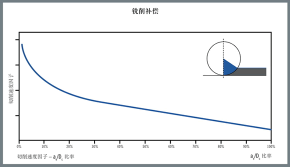 為了保持切削區(qū)內(nèi)的切屑厚度和溫度與刀具在滿刀切削時的值相等,刀具供應(yīng)商制定了補(bǔ)償系數(shù),用于在刀具嚙合量百分比減小時增加切削速度。